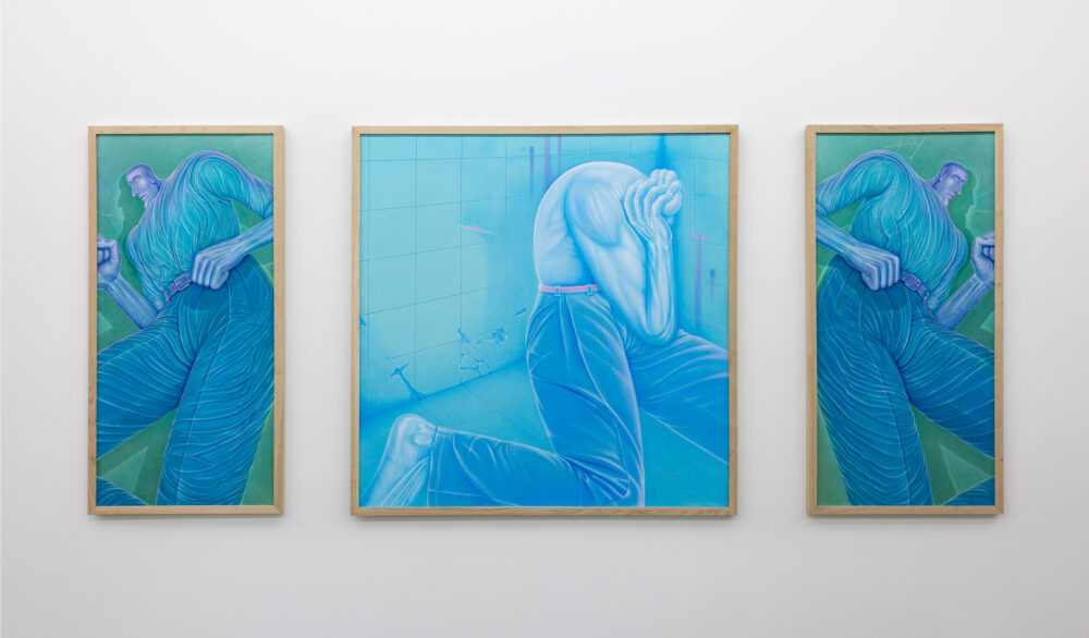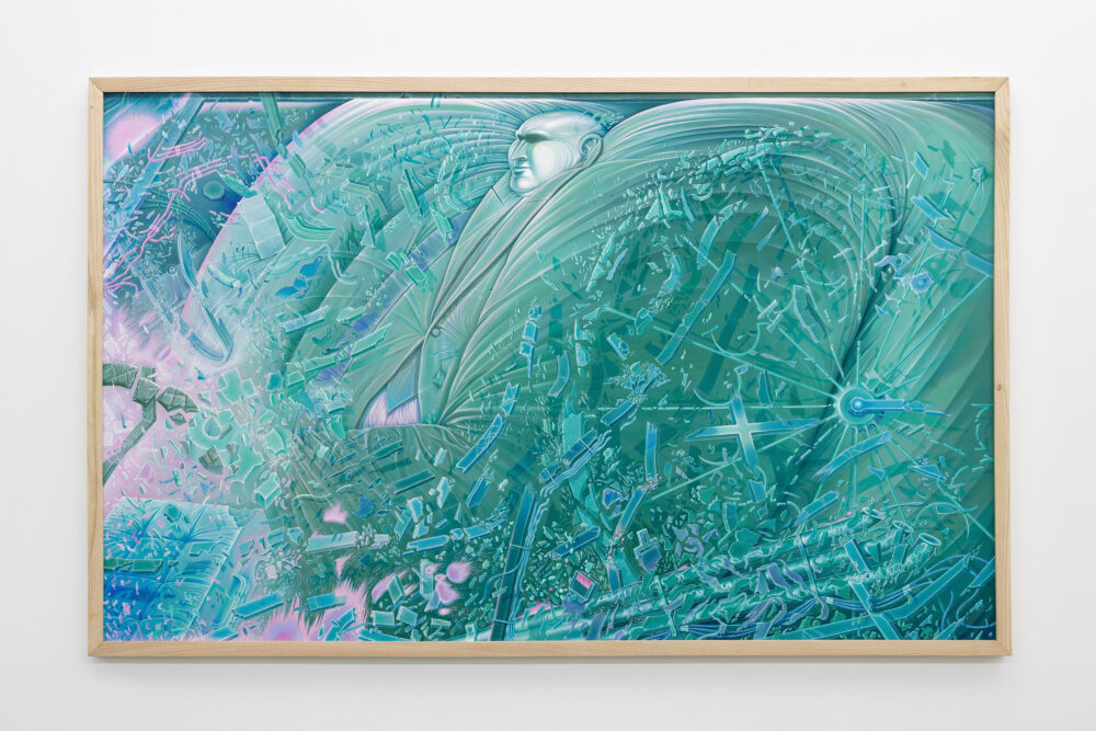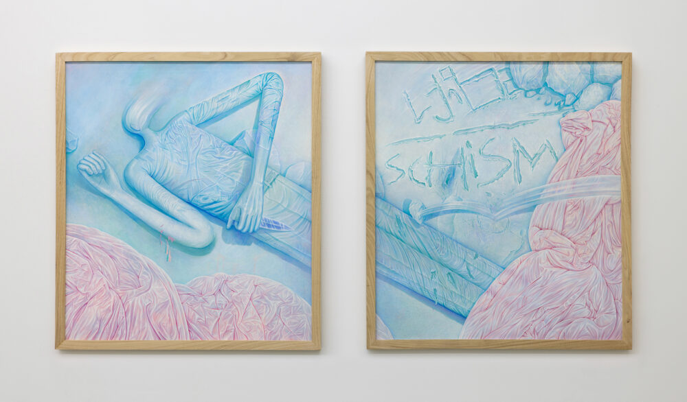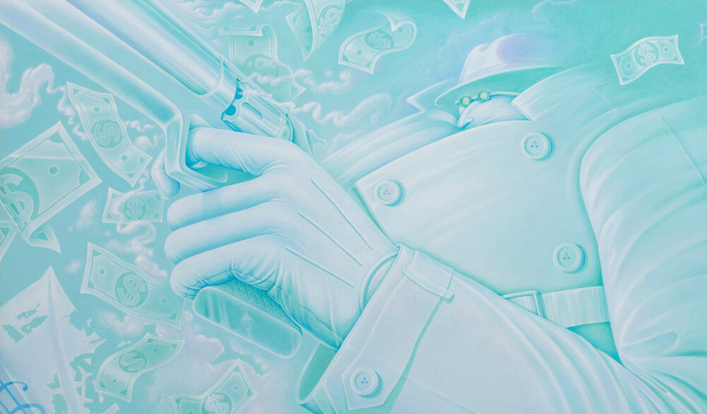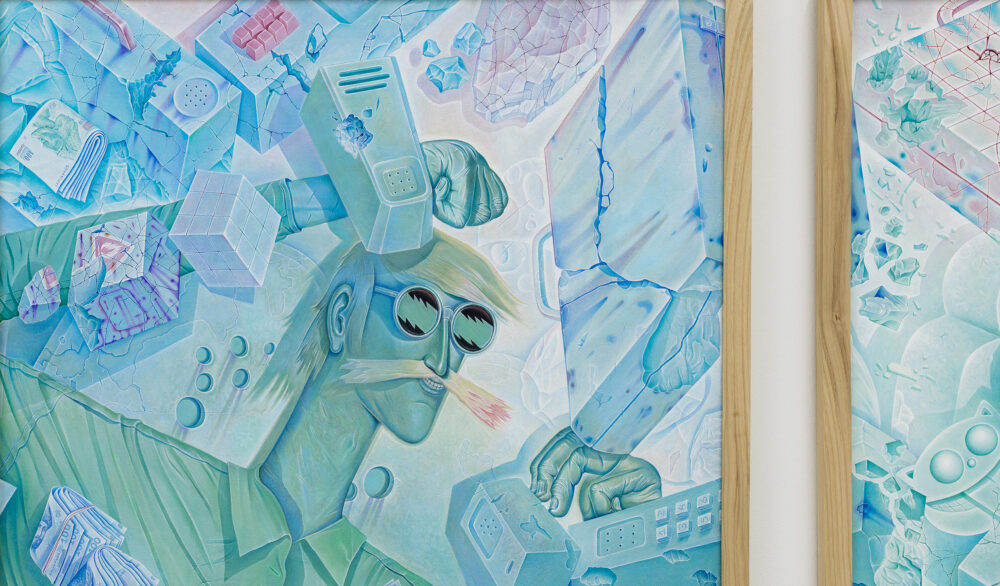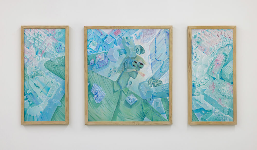 Schism is a series of paintings by Zura Mchedlishvili (Kareli, b. 1988) that reflect on themes of power, greed, obsession, and control. The works depict a moment of a violent rupture stemming from the vices of contemporary society. Shattered fragments of all sorts of materials, from stone to mechanical and technological objects, illustrate a moment of collapse or transition in slow motion. The paintings are characterized by blurring, motion trails, and fragmented forms. They feature currency, digital visuals and technological subjects in dynamic compositions. Satirically rendered, exaggerated figures carry a dystopian and ominous air. The visuals unfolding in the works are at once reminiscent of Futurist paintings and film noir scenes. The figures are highly stylized, with elongated limbs and exaggerated musculature. Seamlessly blended shadows and highlights give the forms a sculptural three-dimensionality. The color palette is restricted, dominated by cool tones, contributing to a sense of eerie stillness.